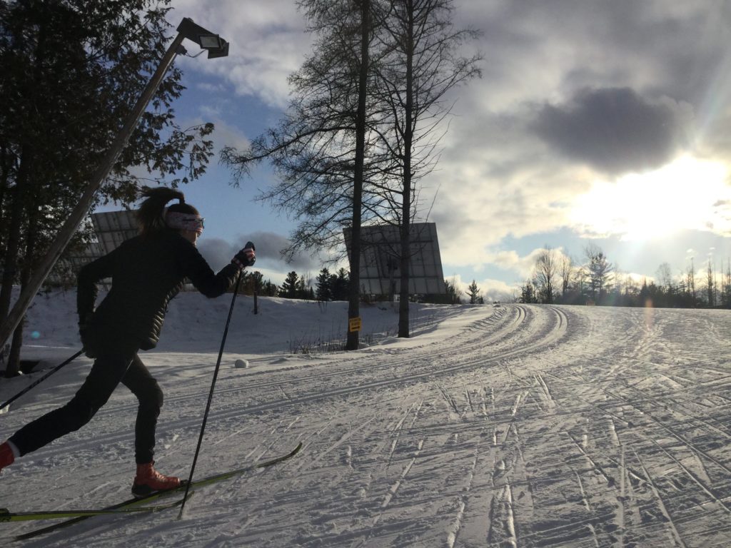 Even later in the day, MNC faces kept popping up either in the lodge or on the trails. Coach Sara was diligently helping folks try new equipment at the Skirack tent, while others switched to a different technique after their lunch break. Coach Rick and I got to even take a lap of our own, a rarity on days like this when there is so much going on! One of the last to leave was Carly, who was taking advantage of the demo day to help figure out just what she was looking for in a new pair of classic skis. I had left just as the sun was rising, and it turns out I was leaving Craftsbury as the sun was beginning to dip down low. I caught this quick photo of Carly showing that alpenglow lighting that so often blankets the Northeast Kingdom in the winter months.