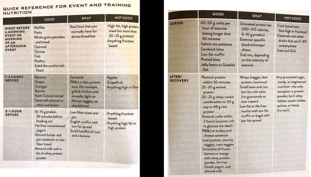 Chocolate milk contains that ideal 4:1 ratio of carbs to protein, so downing some of that right after completing the race will jump-start the recovery for the next day. But there’s way more than just a bottle of chocolate milk involved for optimal recovery. Below is a photo of some helpful charts from the book Roar by Stacey Sims. Note that these are just photos from my phone of the book, so sorry for any copyright infringement…