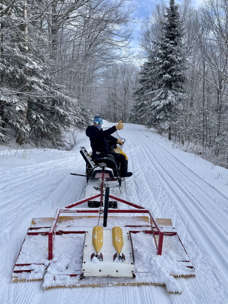 A week later, the temps dropped and the snow finally arrived! With winter in the air, the snow extremely packable and groom-able, and the temps holding below freezing, this past weekend led to a real taste of great skiing. Here’s a picture worth a thousand words: thanks to Steve Crafts for capturing a moment of true Nordic bliss for both skier and groomer!