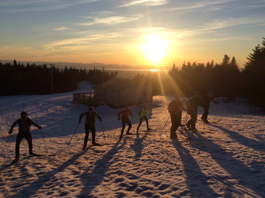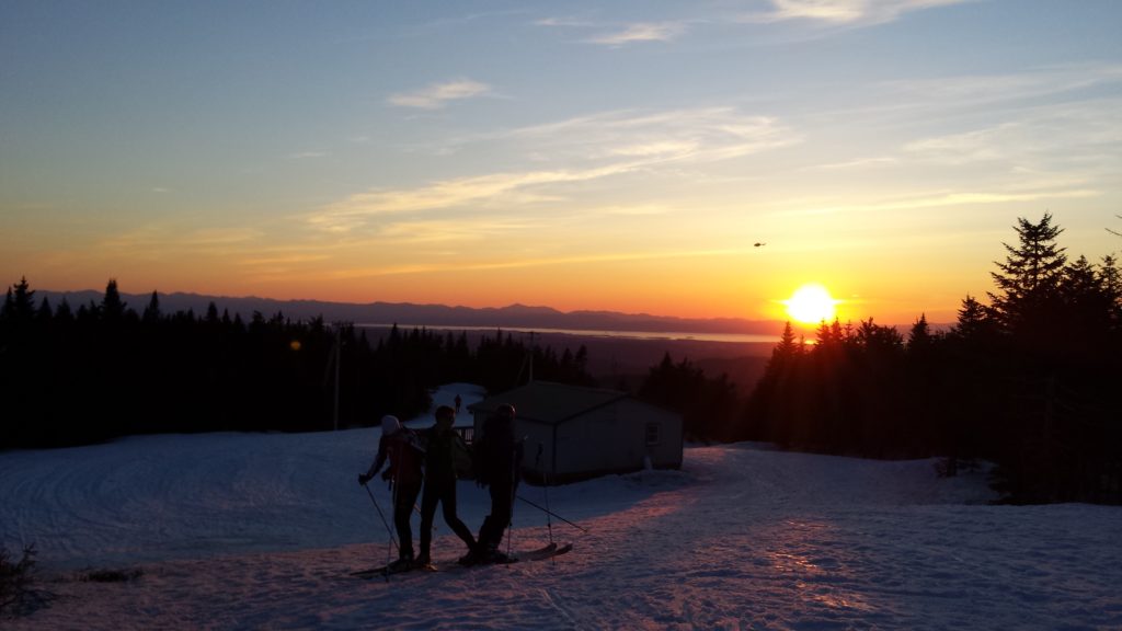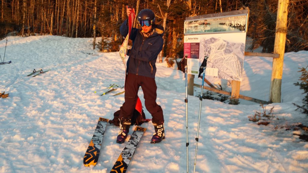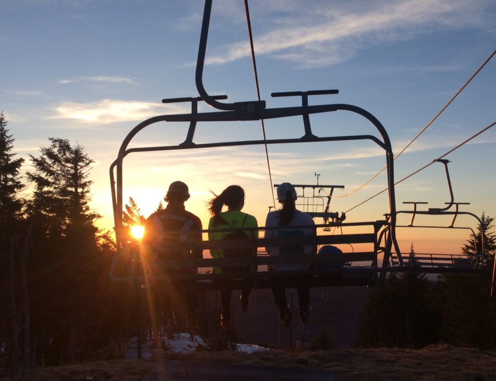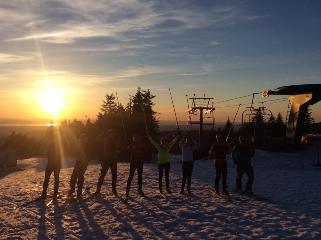 On Thursday afternoon some MNC Masters, Juniors, and guests brought skis to climb Bolton to catch a beautiful sunset from the top of the appropriately-named Vista quad before a nice fast descent. Plenty of late-season snow and warm temps made for a fun spring outing!