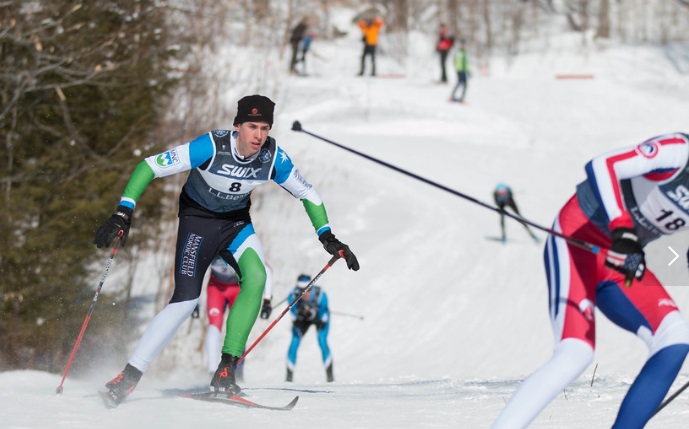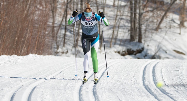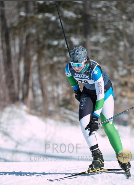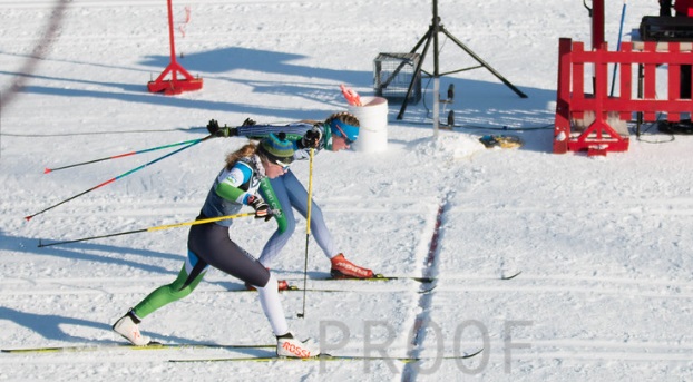 The course featured a lot of rolling downhill at the start, before climbing on mixed terrain toward the legendary High School Hill which was lined with fans and coaches giving their loudest encouragement to tired bodies. The sun was out and after testing wax in puffy coats and squeaky snow in the early morning, most were out enjoying the bright blue sky and snowy trails for the men’s race. The girls team positioned themselves on HS Hill while Charles put forth his best race of the season, catching a ride from the Middlebury College skier who started 15 seconds behind him and sticking it out the whole way to slide ahead of some big competition.
