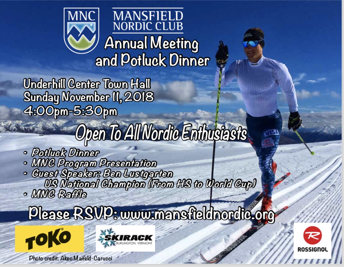 Join us for the Mansfield Nordic Club Annual Meeting at the Underhill Town Hall on Sunday, November 11, 2018 4-6PM. The Annual Meeting will begin with a potluck meal followed by MNC program presentations plus a guest presentation “From HS to World Cup” by Ben Lustgarten,US National Champion, GRP Skier, Burlington native, and MNC alum!