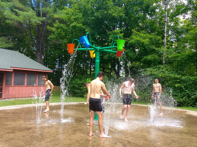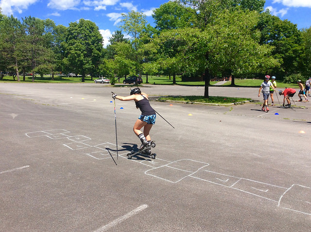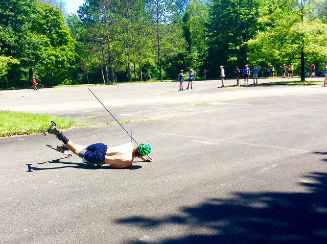 We began the week with a session centered around bounding and various techniques and benefits of it. From there we spent two days on the Lake George bike path rollerskiing in groups and working on lots of drills as well as easy distance. I think we were on skis for 4 hours on Sunday! The bike path is a bit opposite of the Range: lacking in turns and corners but favoring gradual terrain and wide open sections perfect for group work. Temps were in the 90s on the first few days, but luckily the camp facility is equipped with the “Splash Pad”, a perfect water feature for cooling down…and occasionally showering in:
