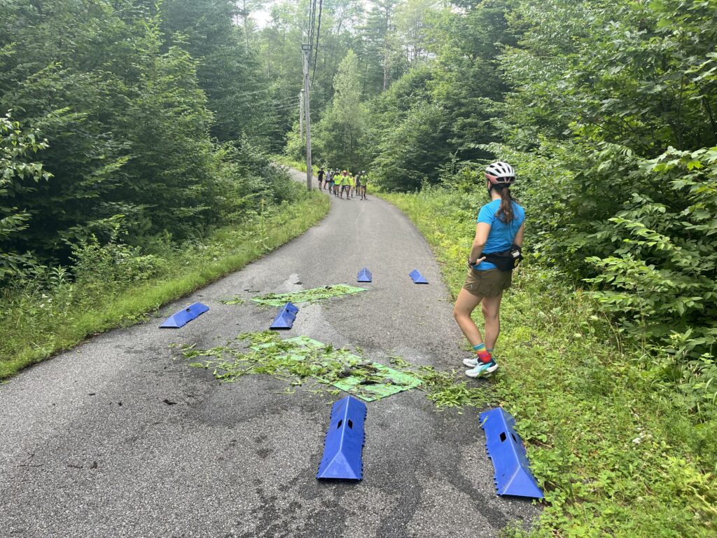 We are in a continual quest to practice our skiing on slippery snow, tough transitions, and unpredictable terrain! Sara had some good ideas to modify our usual “wet leaves striding drill” to incorporate turns and simulate what skiing is like outside the tracks on that rutty, slushy, broken-down snow we so often see on steep hills in bigger races.