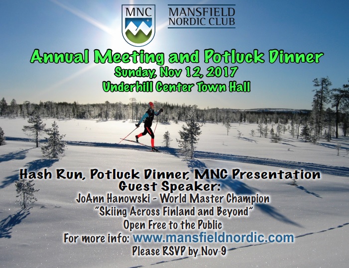 Join us for the Mansfield Nordic Club Annual Meeting at the Underhill Town Hall on Sunday, November 12, 2017. Prior to the Annual Meeting, MNC will offer an optional 3-5 mile hash run (details below). The Annual Meeting will begin with a potluck meal and the MNC program presentation followed by a multi-media presentation by World Master Champion, JoAnn Hanowski. (Skiing Across Finland and Beyond)