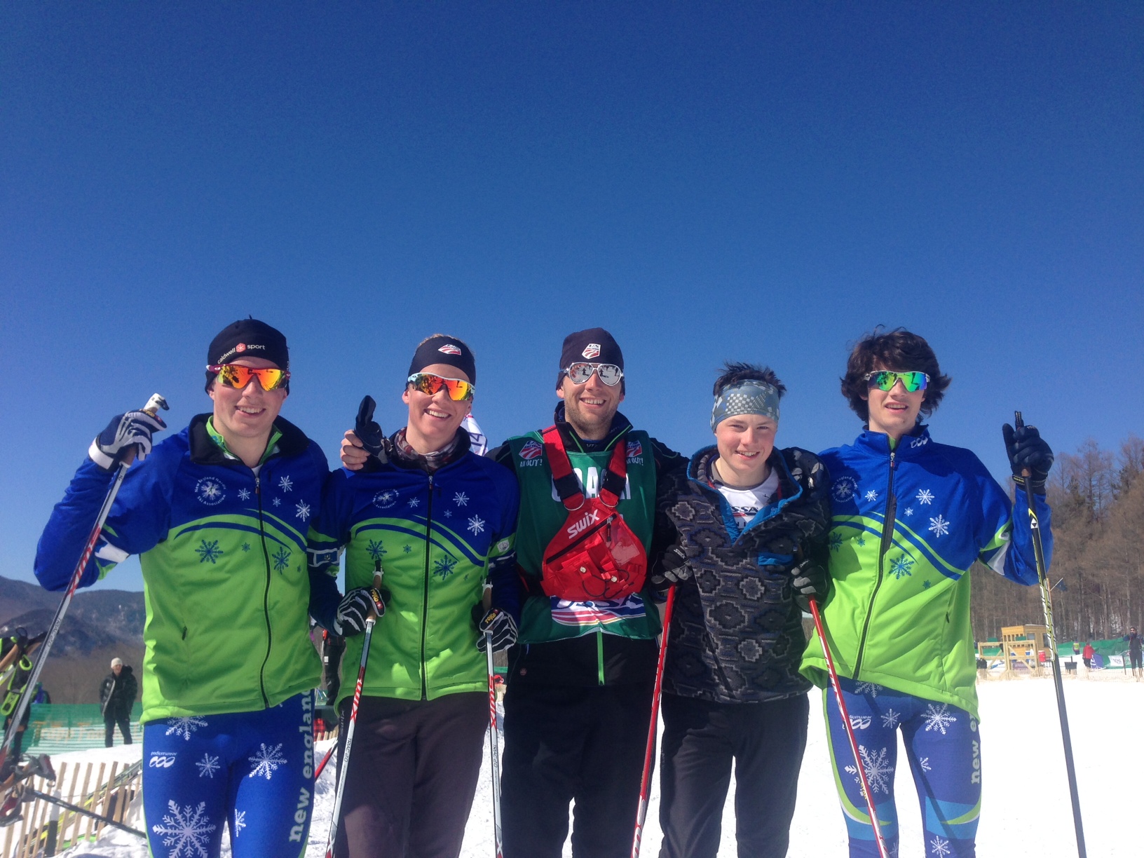 Henry Harmeyer (2nd from Left), Tim Weston (center) and Ben Hegman (far right) after the mass-start races at Junior Nationals