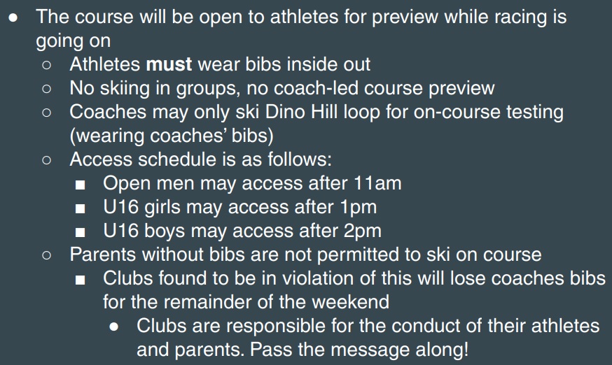 Specifically for Saturday’s interval start races, there are VERY strict control measures on skiing the course.