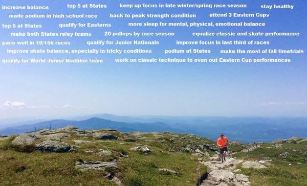 We began training yesterday with some goal-setting and sharing. Learning to set goals, track progress and evaluate performance is far more than just a ski-specific skill, but for skiers at every level various goals are a prime motivator for training, racing and maintaining focus. We used simple ‘goal pyramids’ to outline and visualize multiple goals…the idea is to think about how certain goals build into one another. At the top of the ‘pyramid’ is a big goal that might seem daunting. What part of the process is all about, however, is actively thinking about what leads to the accomplishment of that top goal. Wider elements of the pyramid are building blocks along the way, and they all matter!