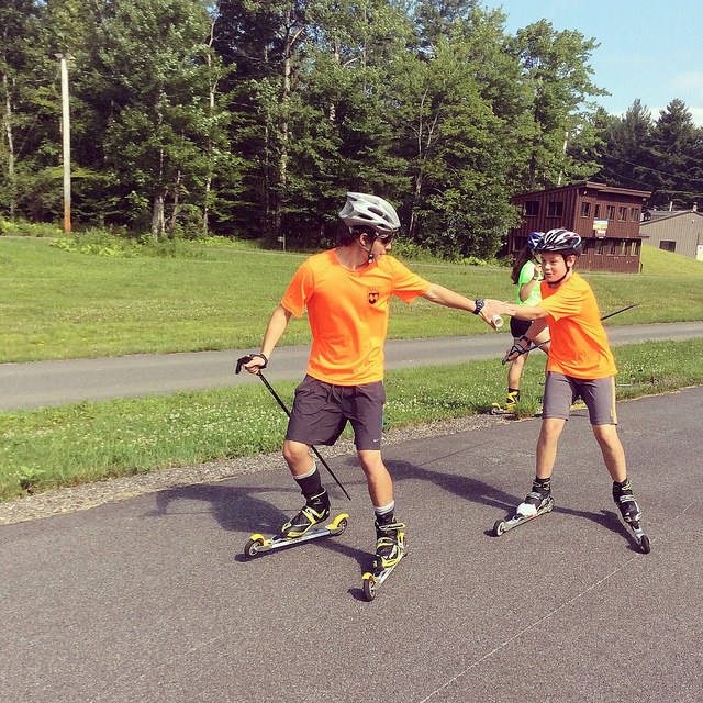 We finished off 2 big volume weeks with the Reverse Stowe Derby yesterday. What an amazing summer day! Since we were in the Stowe area I called up the Craftsbury gang (it doesn’t hurt that former MNC Bill Koch coach Anna is now working there) and asked if they would join us. Coach Rick also came along and the workout was a big success. The plan? Rollerski from the church in Stowe along the bike path, switch to running shoes and get to the top of Mansfield! It all worked out with many different age groups and ability levels…somehow we all ended up where we planned to within about half an hour of each other. Since the coaches were skiing and hiking right along with the skiers I didn’t get too many pictures, but here are some that show what the day was all about. A big thanks to Craftsbury for joining in for some training!
