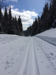 On Sunday, we drove a little further up the highway to the Foret Montmorency – known for its early season snow. This research forest offers skiing (16.50 CAD) of 41km classic trails, 16km skate trails and 22km off trail skiing. This area is so unique and so incredibly beautiful. The groomers had been busy after receiving 44 cm of fresh powder in just the last 48 hours…this on top of over 130 cm of snow pack! The skiing here is heavenly, along wide forest roads that are groomed beautifully for skate and classic – running through snow laden trees along a river or up onto a beautiful mountain with spectacular views.