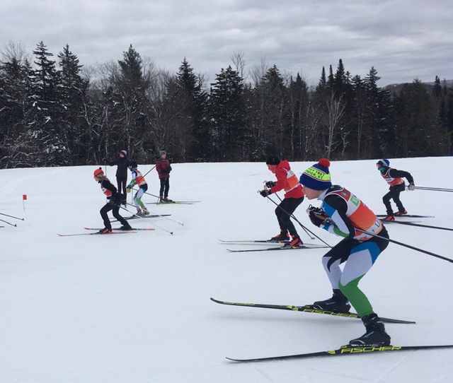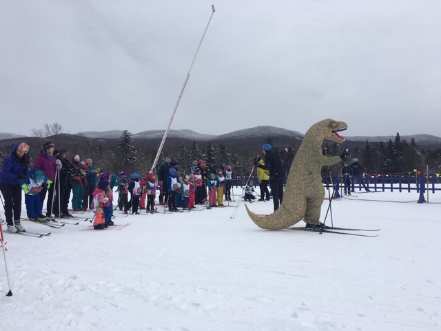 When the lollipop race starts off chasing a T-Rex dinosaur on skis, you know it’s going to be a fun day! Such was the vibe at this year’s Silver Fox Trot down at Rikert Touring Center in Ripton. A bit of natural snow boosted skating conditions on Rikert’s man-made loops and even though it was cold, skis were relatively fast and the downhill corners never got icy.