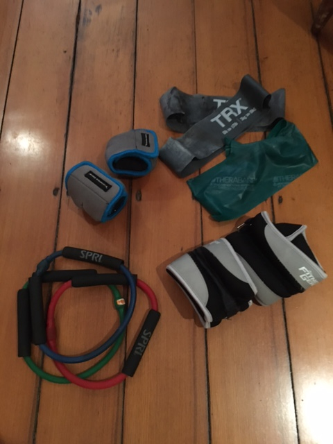 - Ankle/Arm weights in hands: hold in hands and lift out to side, down, then up in front, then down, repeat. Use 2-8 lb arm weights.