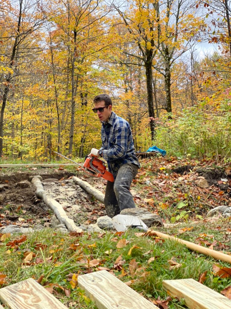 When all 4 beams were in position, I used the chainsaw to lightly mill a flat surface on top. It was about this point that not only was I getting a face full of sawdust, but Mike and I were actually getting hit by the first snow of the season!