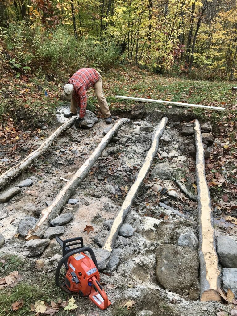 Mike and I cut into the surrounding earth to “bench-in” the beams. They were buffered with large and small rocks. In this photo we are making sure the distance between the widest beams is equal across the length of the span