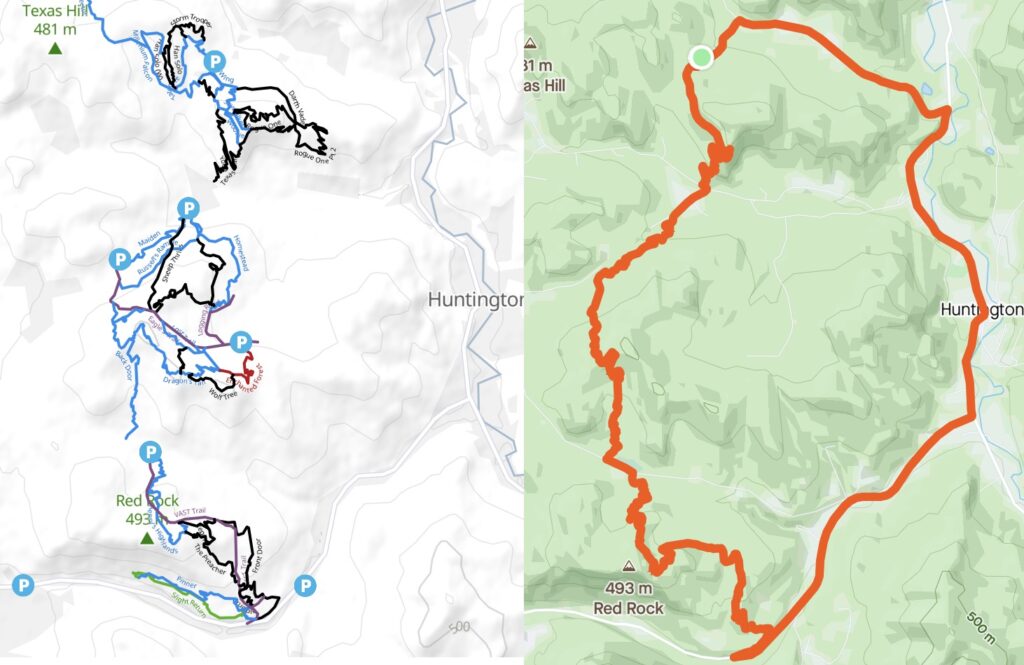 Each of these networks is its own small hill, bisected by dirt roads between Huntington Road and Richmond Road/116. A connector trail from each network leads down to a dirt road where you can pick up the next network…
